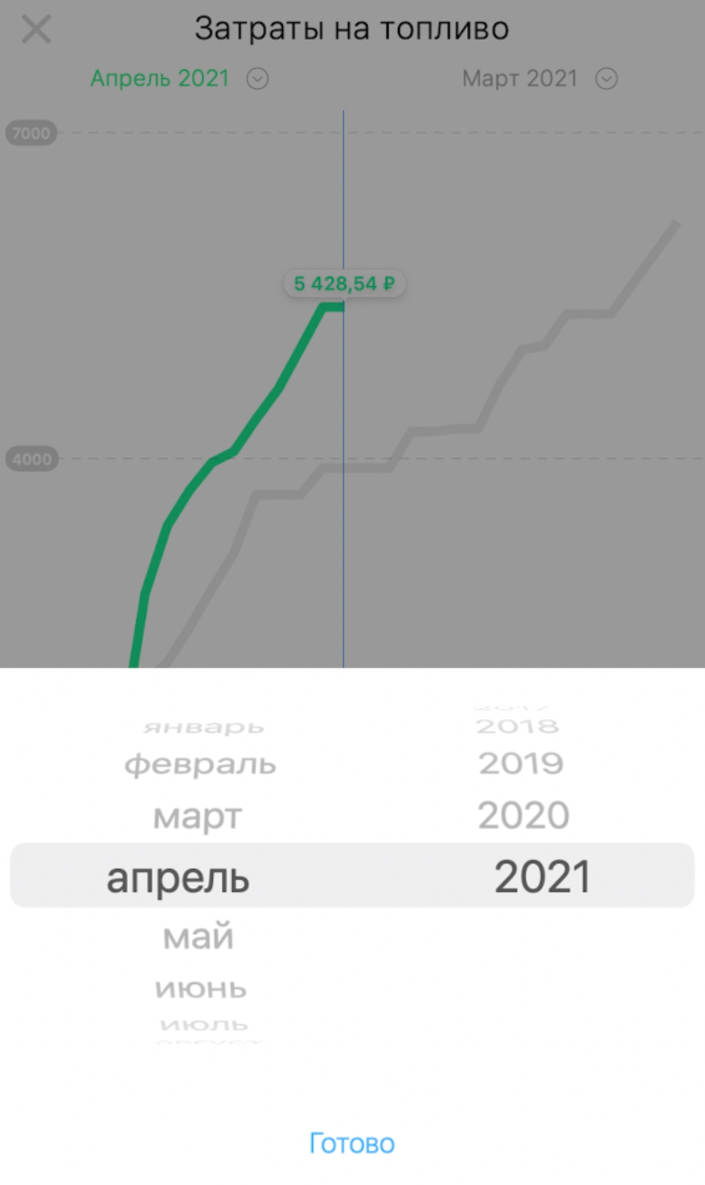 При детальном просмотре в приложении вы можете выбрать месяц, для которого необходимо отобразить статистику. Для этого нажмите на название указанного месяца и в приложении отобразится список месяцев, для которого можно просмотреть статистику о стоимости затраченного топлива.