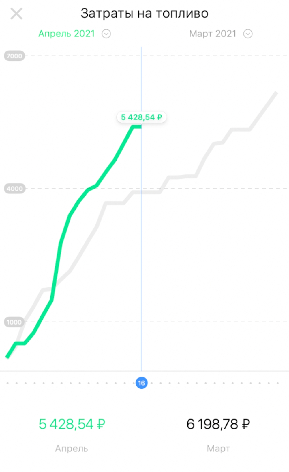 При нажатии на график на экране статистики открывается график с детальной информацией, который отображает статистику о стоимости затраченного топлива за выбранный период.
